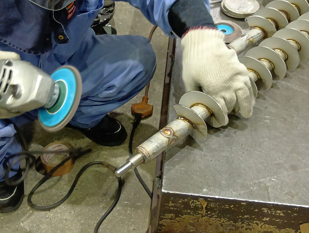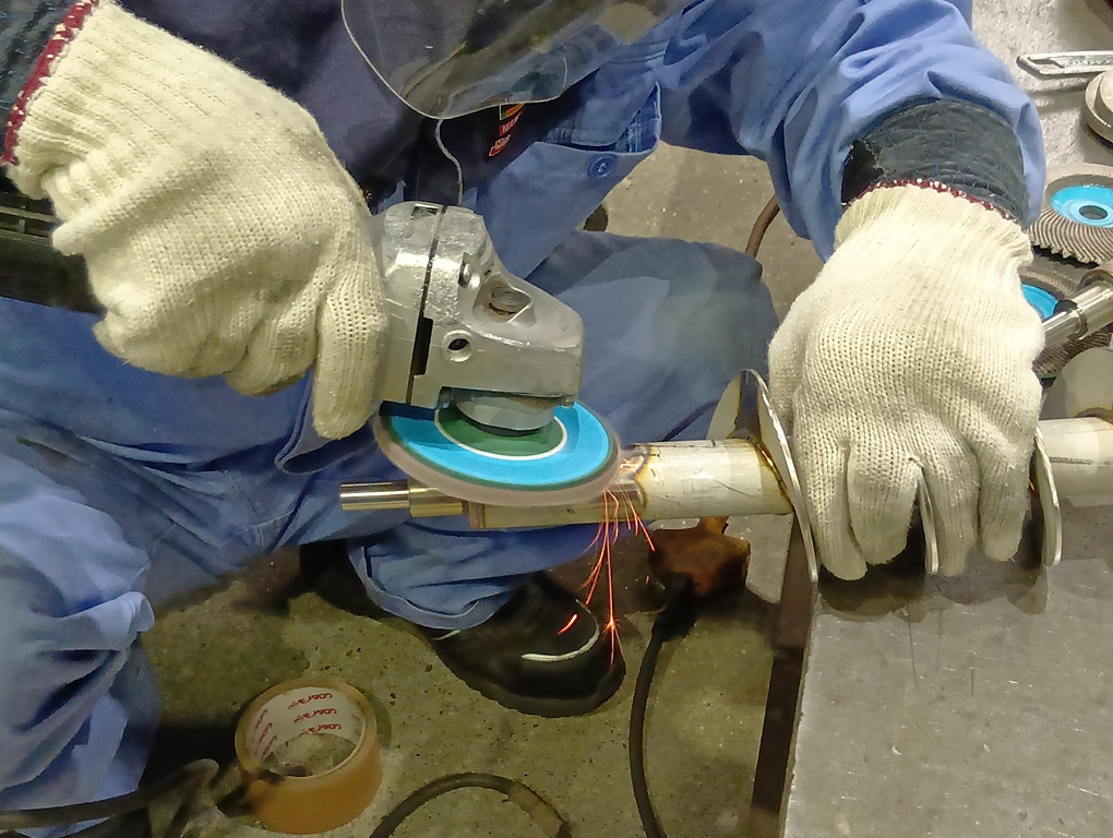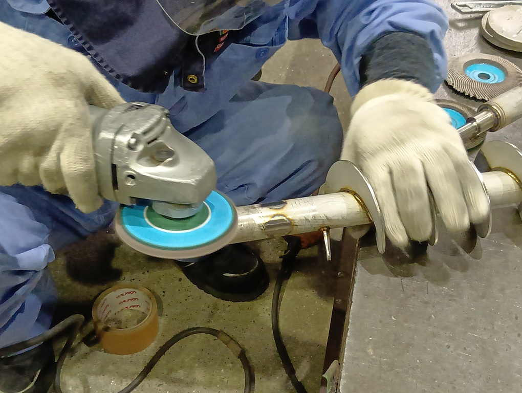 栓溶接するとパイプの外にピンがはみ出てしまうため、グラインドカットすることで表面を滑らかにする必要があります。