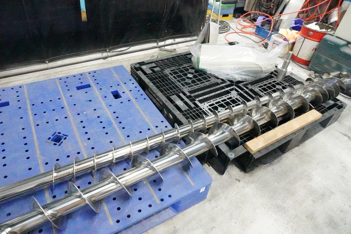 サイズの異なるスクリューフィーダーとケースを全部で8本受注しました。完成後は食品工場に納品予定です。