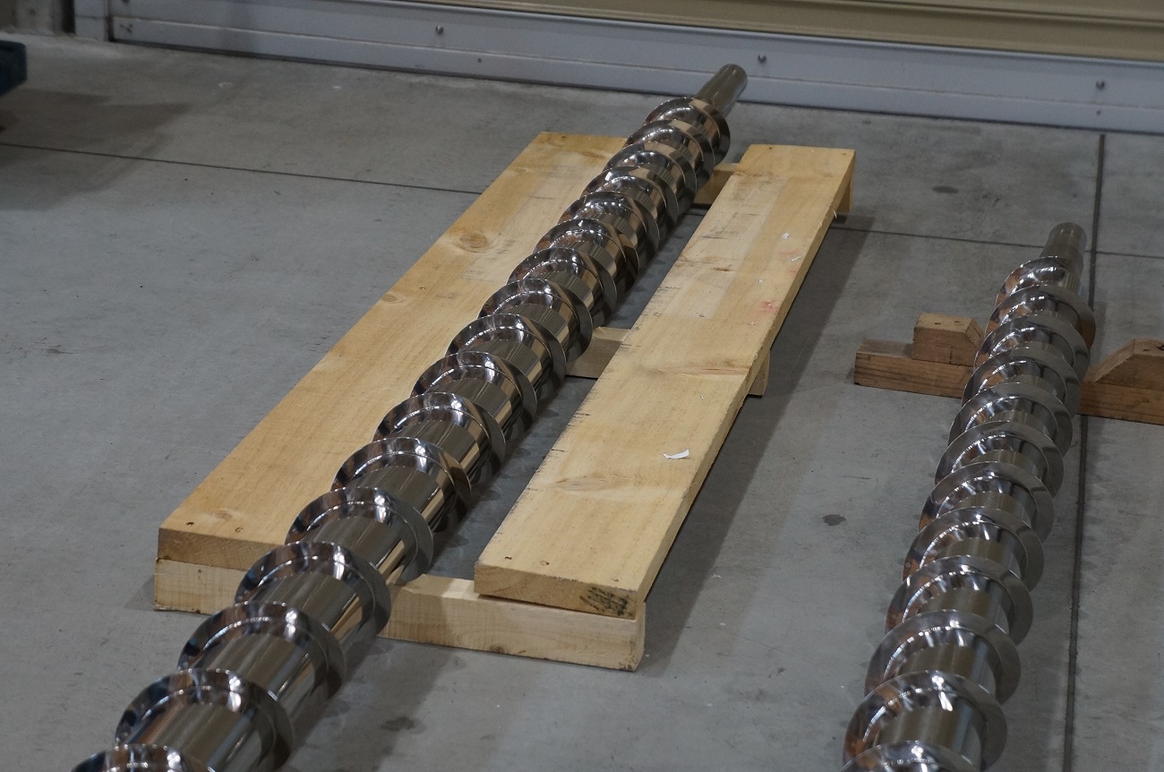 羽根がとても短いスクリューフィーダー。バフ研磨を終え、組み立てているところです。こちらは化学メーカーに納品予定で、プラスチックの原料輸送に使われます。